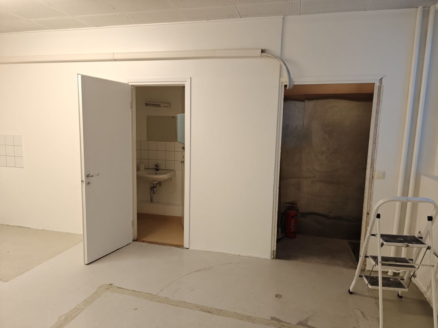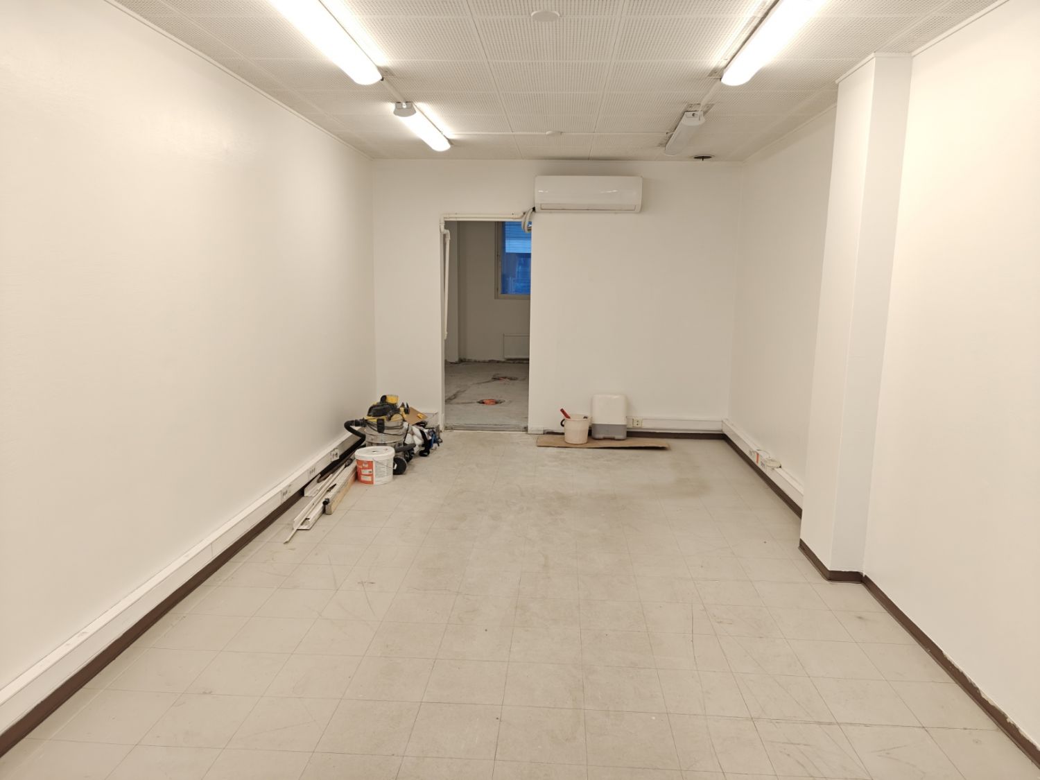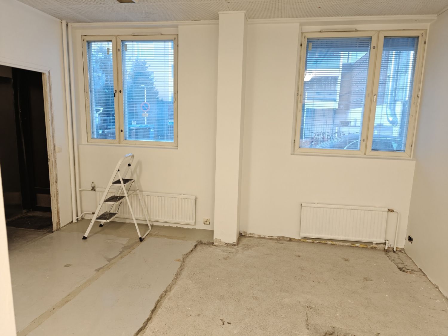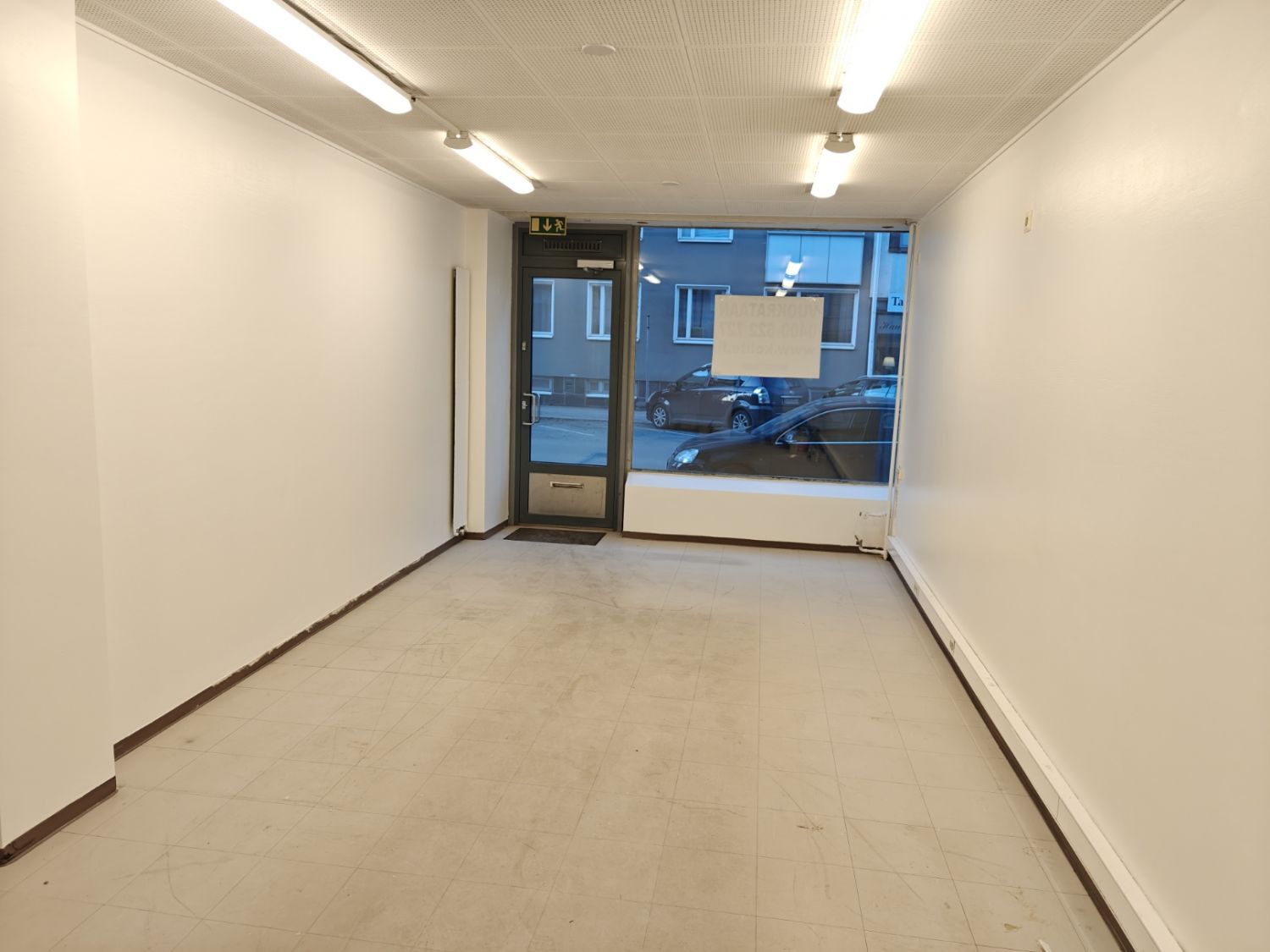 Liiketila, jossa etuosassa pitkänomainen liiketila, takaosassa kaksi wc:tä ja iso huone, ikkuna ja ovi sisäpihalle.