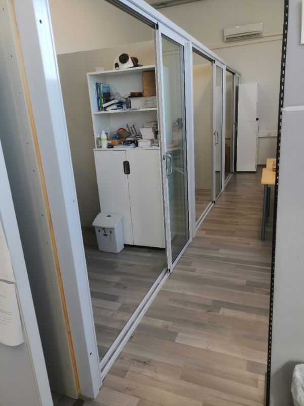 Erilliset kulkuovet helpottavat liikkumista hallin ja toimiston välillä.
