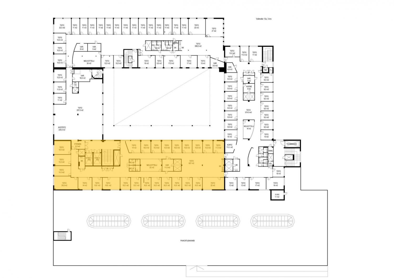 Toimistotila rakennuksen kolmannessa kerroksessa. Sisältää sekä yksittäisiä toimistohuoneita että runsaasti avointa tilaa. Tilaa on mahdollista remontoida mieleisekseen esimerkiksi yhdistämällä pienempiä toimistohuoneita ja jakamalla tilaa moderneilla lasiseinillä. Tila mahdollista yhdistää saman kerroksen 699,5m2 ja 297,5m2 tilojen kanssa.