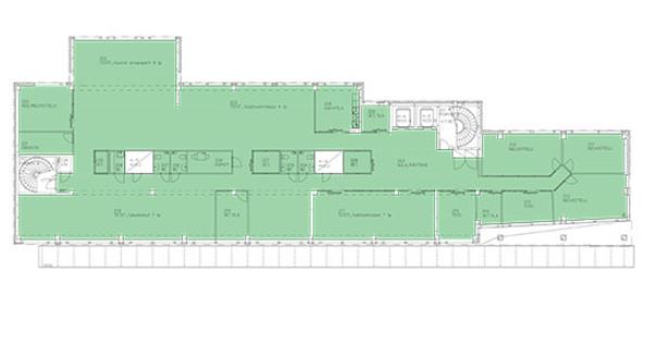 Tilaratkaisut perustuvat osin huonetiloihin ja osin avotiloihin. Väliseiniä on tarvittaessa helppo siirtää ja muokata siten tilat tarpeiden mukaiseksi. Kaikissa kerroksissa on keittiövarustus.