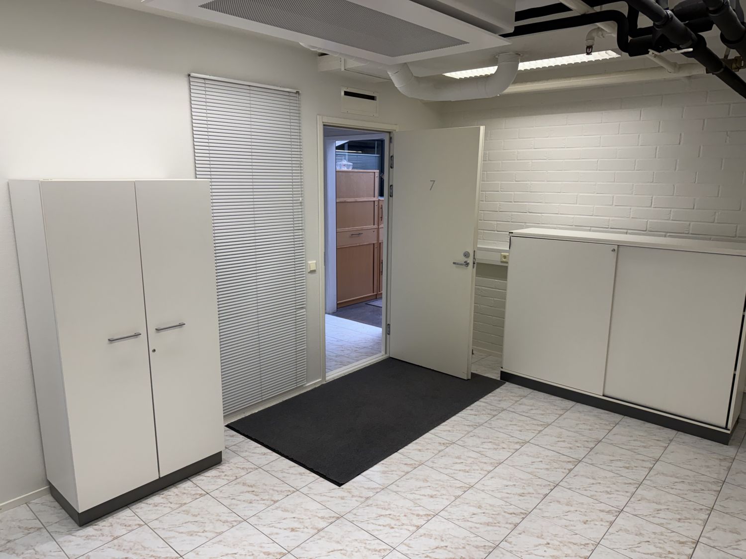 Toimistohuone sijaitsee kiinteistön alimmassa kerroksessa ulko-oven läheisyydessä.