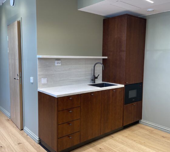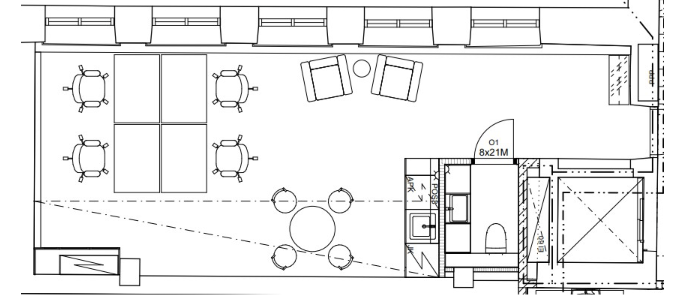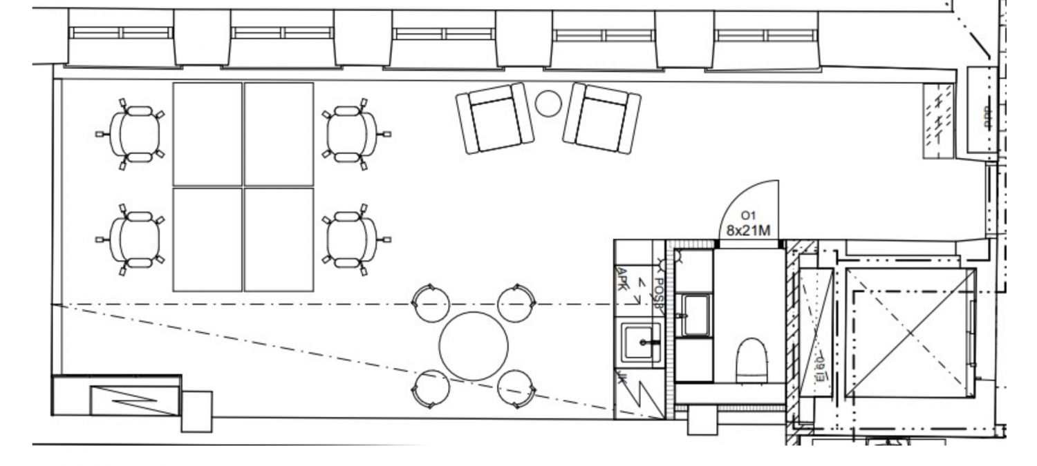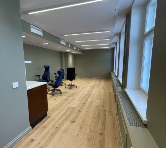 Viidennen kerroksen avotoimistotila, josta avautuvat näkymät rauhalliselle sisäpihalle. Tila on valoisa ja edustava, ja siinä on oma keittiö sekä wc. Avotila mahdollistaa joustavan työskentely- ja kalusteratkaisun, joka voidaan räätälöidä yrityksen tarpeiden mukaan.