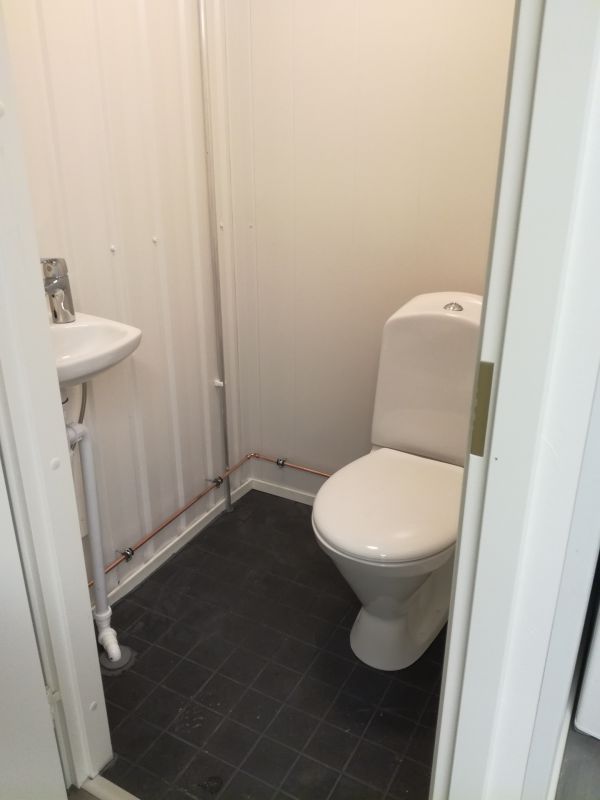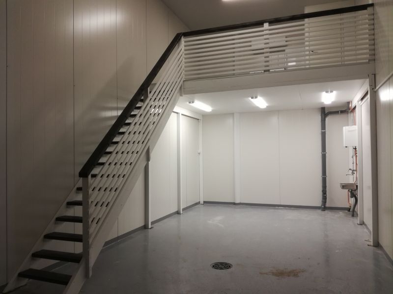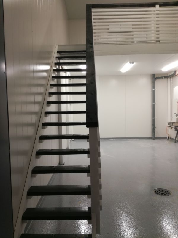 Seinissä metallipinnoitus ja helppo pitää siistinä, lattia epoksipinnoitettu. Parven etuosa avoin ja lattiat laminaattia, wc:n lattia laatoitettu.