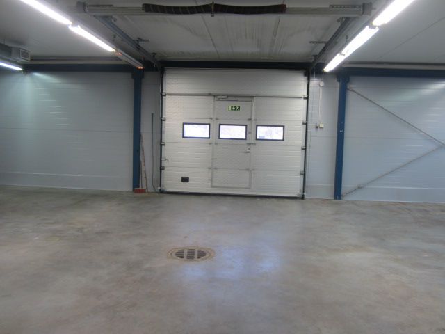 Käynti etupihalta nosto-ovesta (kork 3m) sekä käyntiovesta.