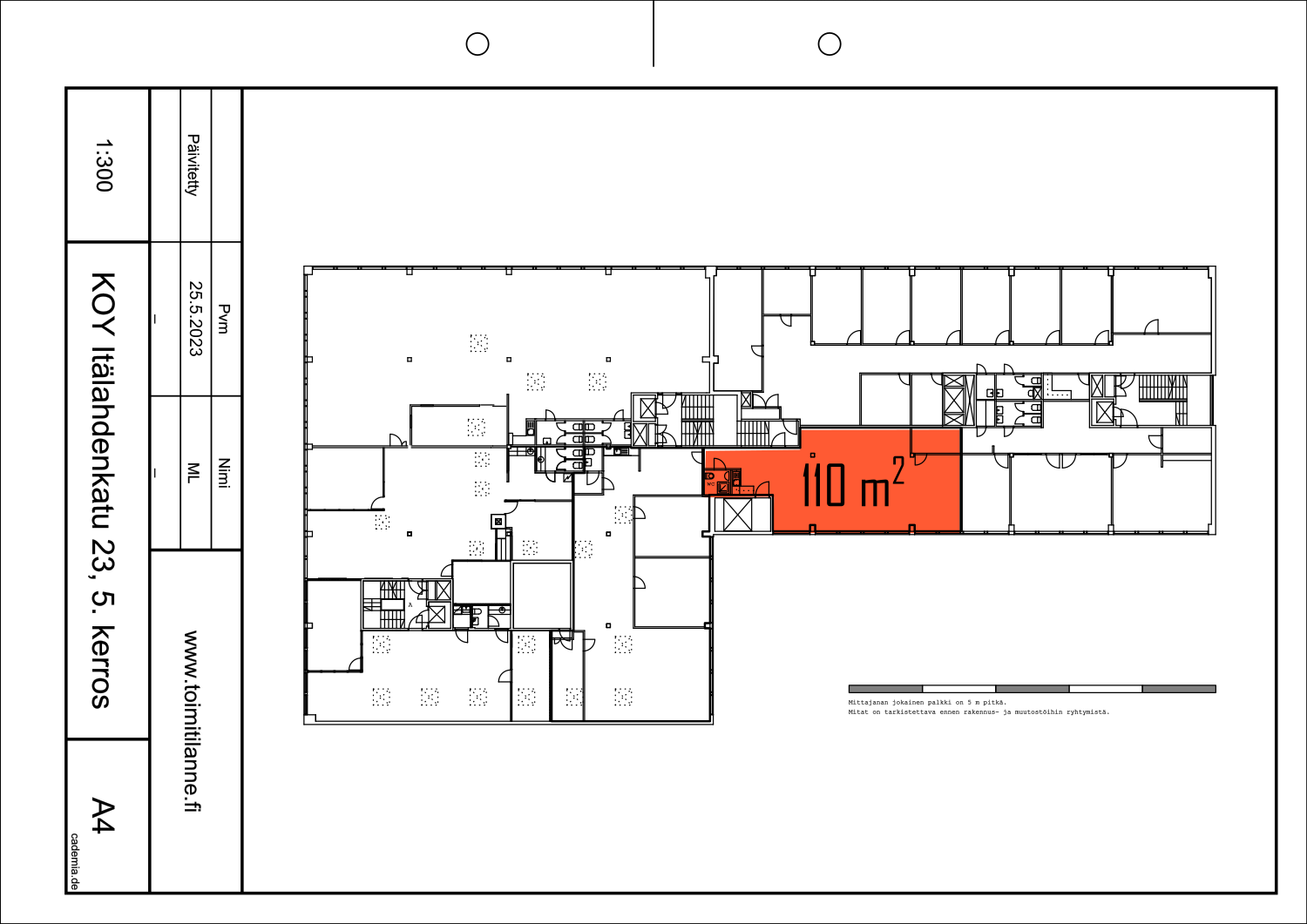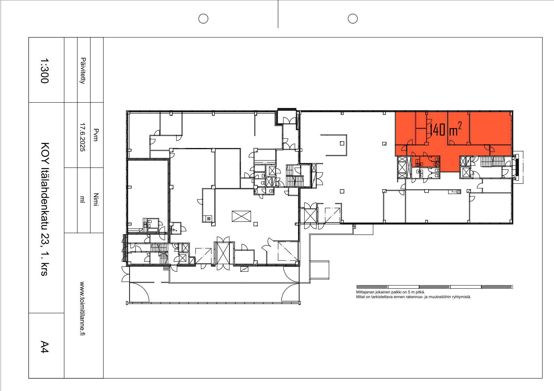 Vapaat varastotilat: 35 m² (tavarahissi) 4. kerroksessa ja 110 m² katutasossa (lastauslaituri).
