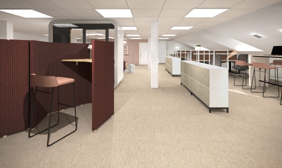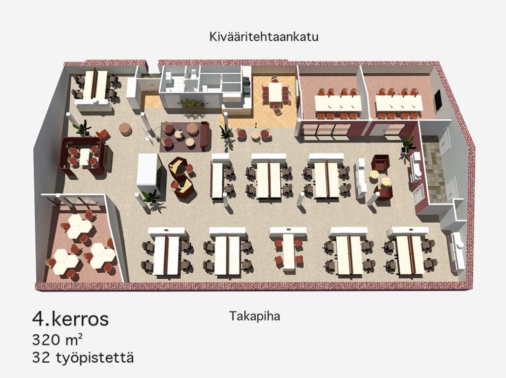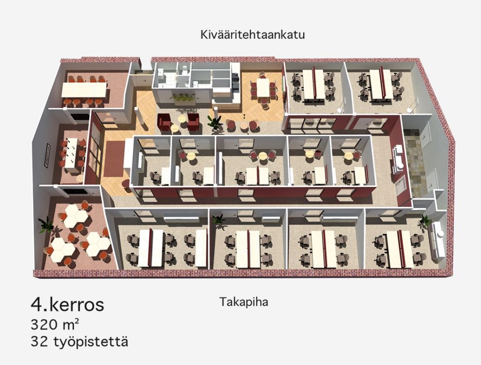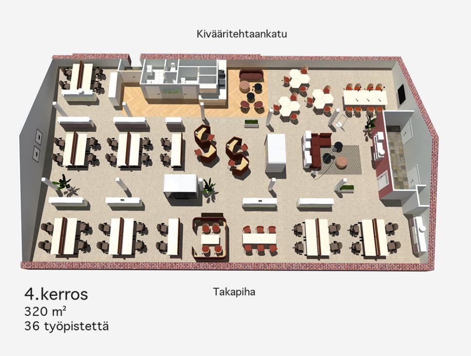 Siisti ja nykyaikainen, jäähdytetty toimistotila 4. kerroksessa. Tilassa vaihteleva huonekorkeus persoonallisen harjakaton ja kattoikkunoiden ansiosta. Tila voidaan myös jakaa pienempiin kokonaisuuksiin. Ohessa havainnollistavia kuvia.