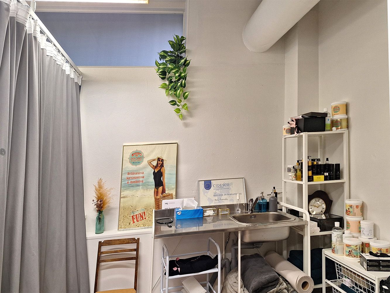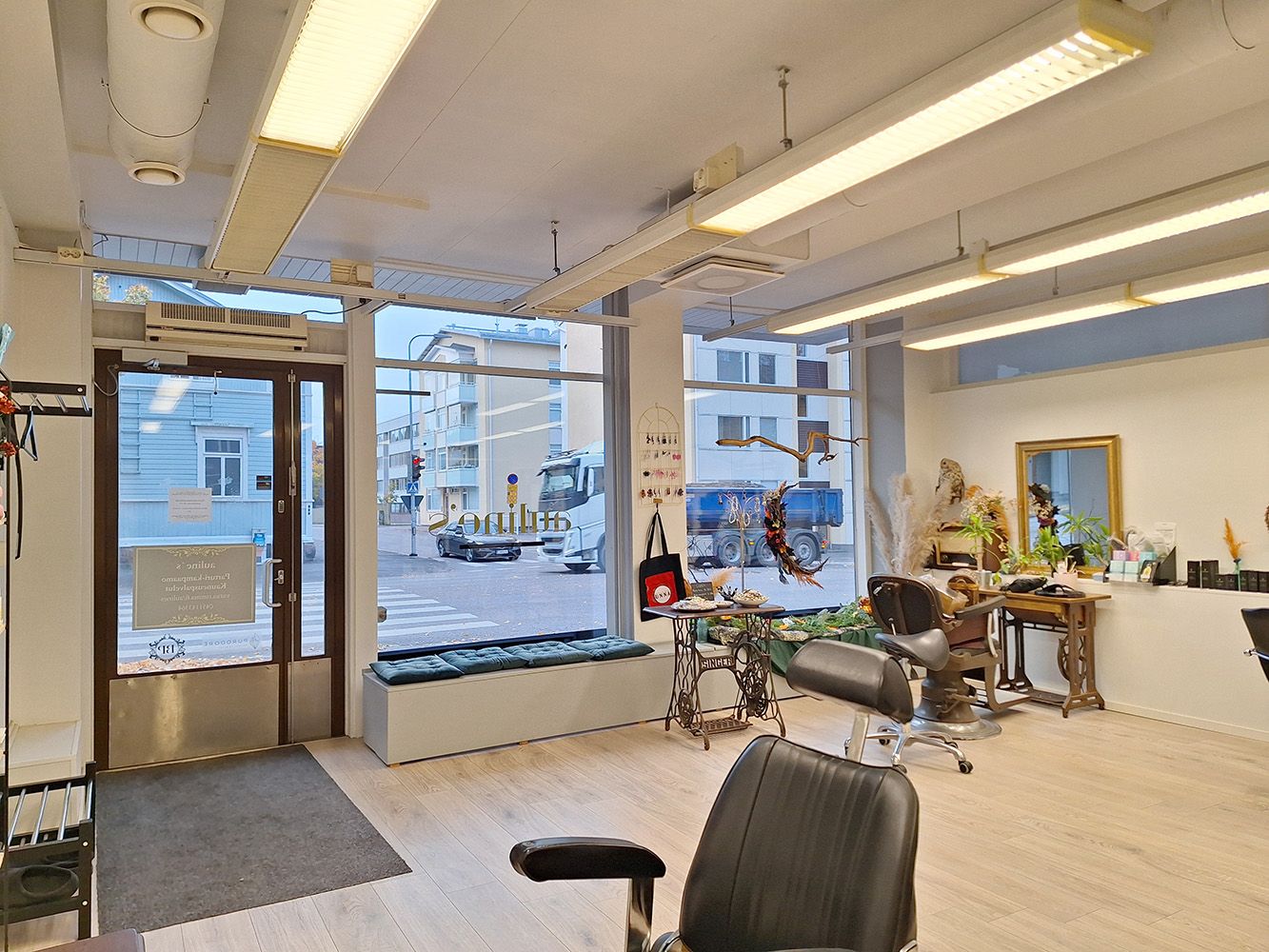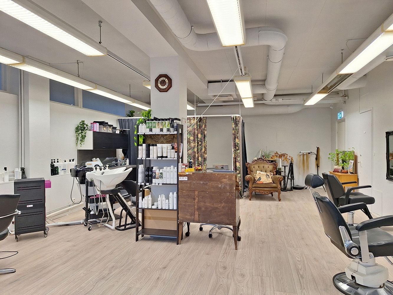 Tilassa on kampaamolle tai kauneushoitolalle vesipisteet valmiina. Erillinen takahuone, missä pieni keittiö ja siivouskomero. Liikehuoneiston kautta kulku wc-tilaan.