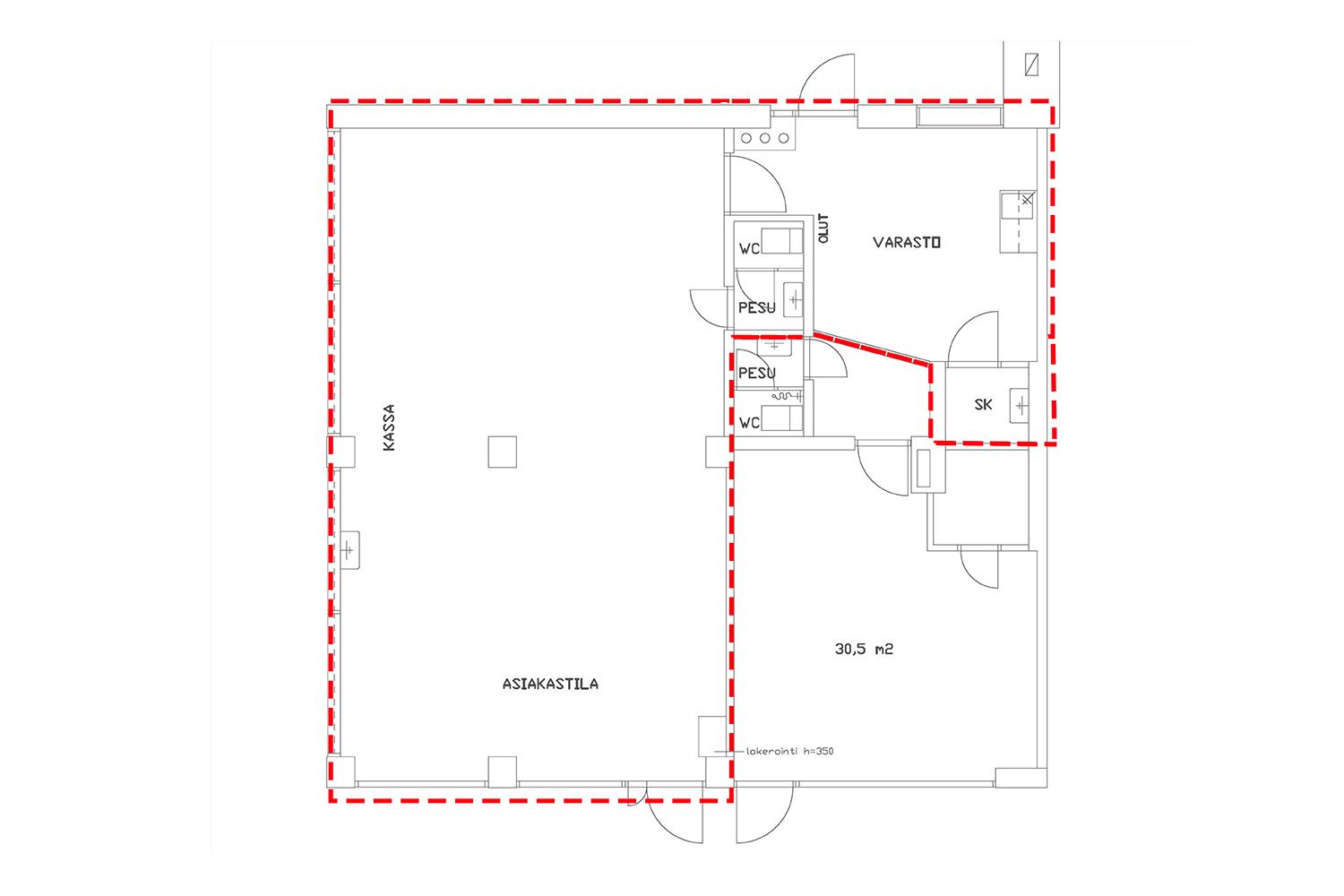 Kunto, varusteet ja palvelut: Siisti tila. Myymälän/liiketilan avoin tila, keittiö, wc ja siivouskomero.