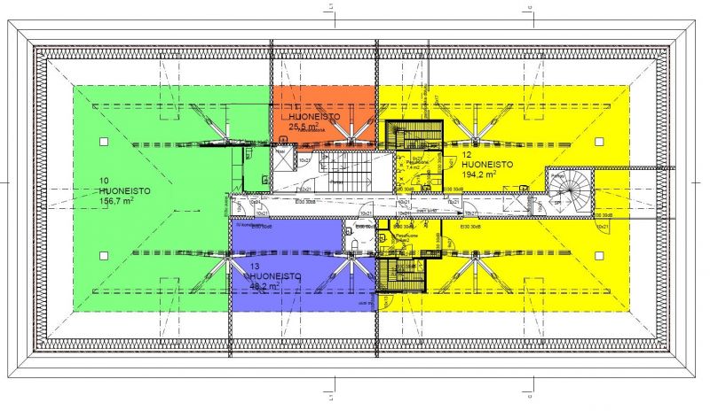 3. kerroksessa on n 376 m2 persoonallinen ullakkohuoneisto katto- ja lyhtyikkunoilla.