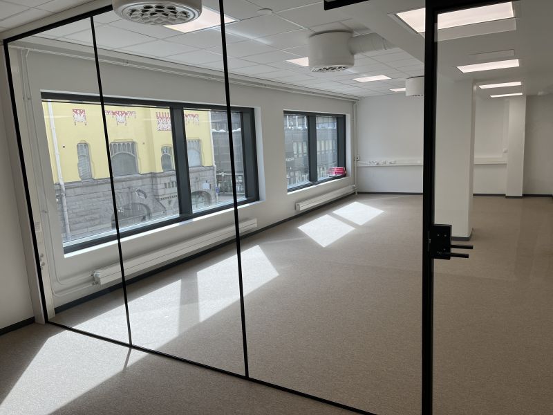 Nyt vapautumassa moderni avotoimisto Kuninkaankadun kävelykatuosuudella! Avotilan perällä on erillinen, lasiseinällä erotettu tila, jota voi käyttää esimerkiksi neuvotteluihin tai videopalavereihin.