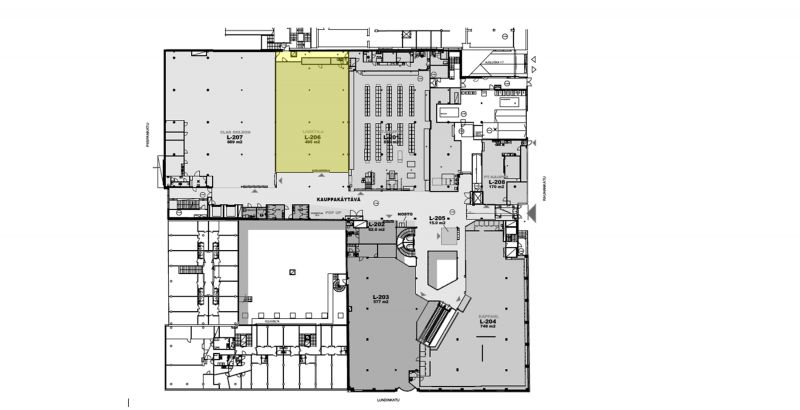 Kauppakeskus Lundissa on vuokrattavana laadukas, erinomaisessa kunnossa oleva, noin 495 m²:n liiketila. Huoneisto on merkitty pohjakuvaan keltaisella värillä.