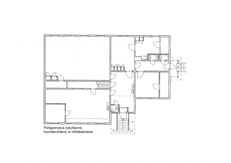 Ohessa on sekä pohjakuva rakennuksen nykytilanteesta että aikoinaan mahdollisen paritalon pohjapiirros. Vanhassa havainnekuvassa/ piirroksessa rakennus on jaettu kahdeksi eri kokoiseksi asunnoksi, joista toinen on neljän–viiden huoneen 148-neliöinen huoneisto, toinen 57-neliöinen kaksio.