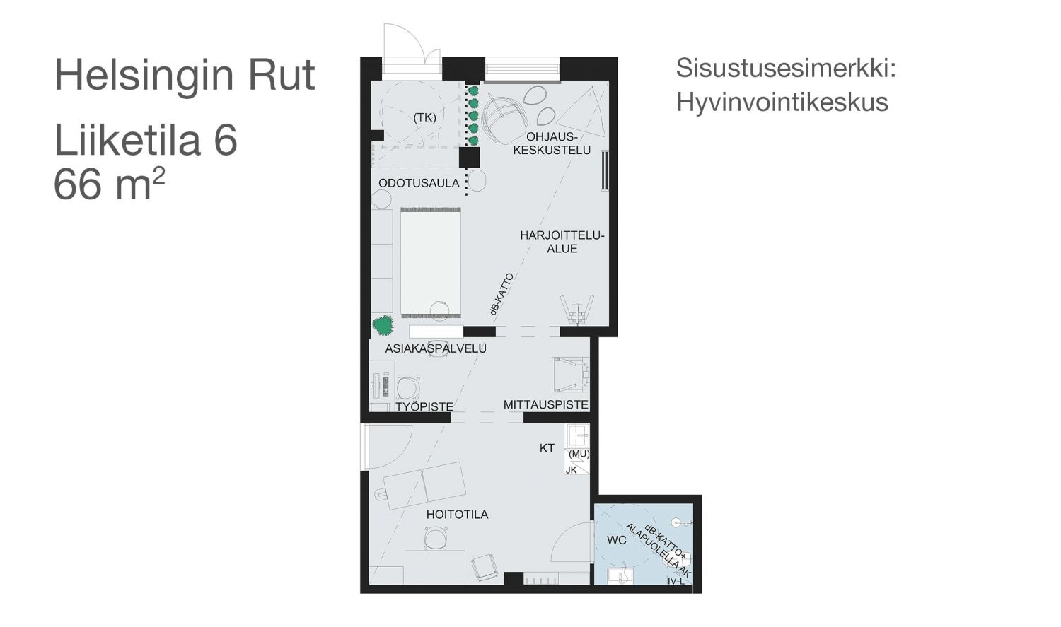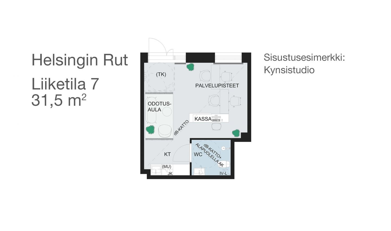 Kaanaankadulle nousevan Asunto Oy Helsingin Rutin katutasossa on neljä liketilaa. Kaikki soveltuvat esimerkiksi palvelu-, kauneushoito-, kampaamo- tai myymäläkäyttöön. Voit myös yhdistellä kahdesta tai kolmesta liiketilasta yhden isomman. Kysy lisää YIT Asuntomyynnistä, p. 020 433 2990!