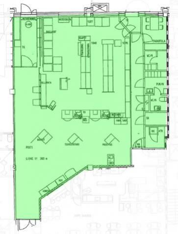 Sisältää sosiaalitilat ja wc:t. Ei taivu esim. ravintolaksi.