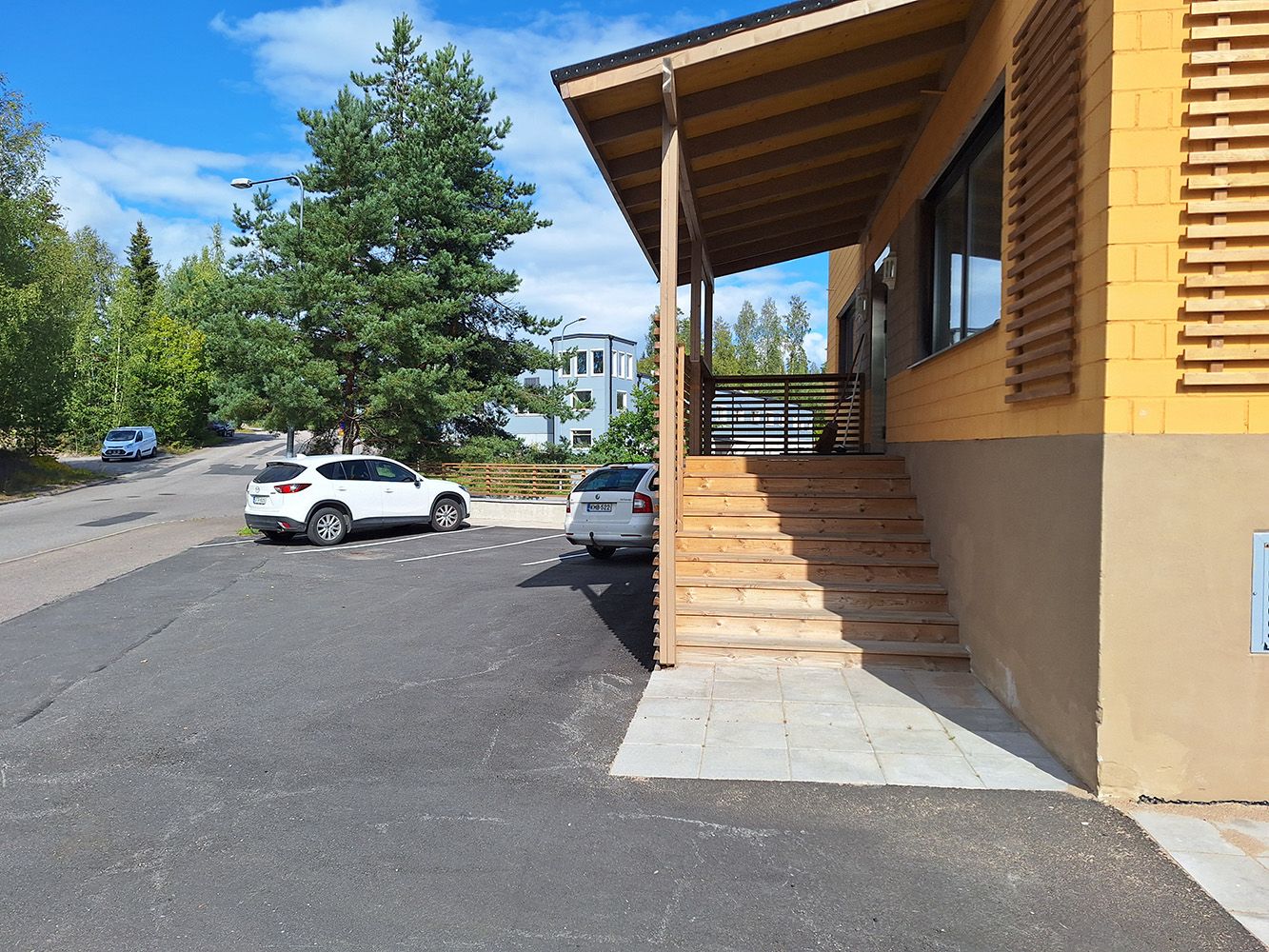 Toimistorakennus sijaitsee rinteeseen tehdyn rakennuksen toisessa kerroksessa, mutta kulku tiloihin on katutasosta muutaman porrasaskelman verran. Rakennukseen on lisäksi toinen, esteetön sisäänkäynti. Rakennuksen edessä on vain muutama parkkipaikka, mutta alapihalla on hyvin pysäköintitilaa.