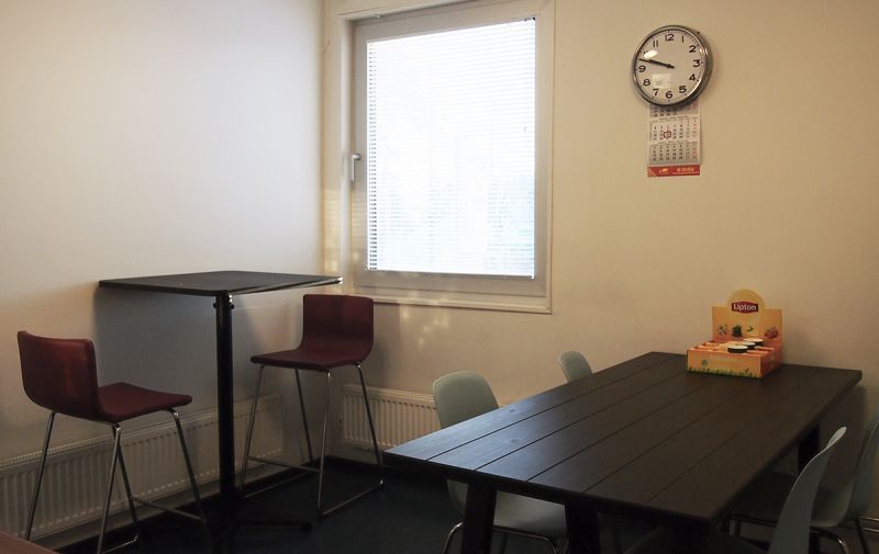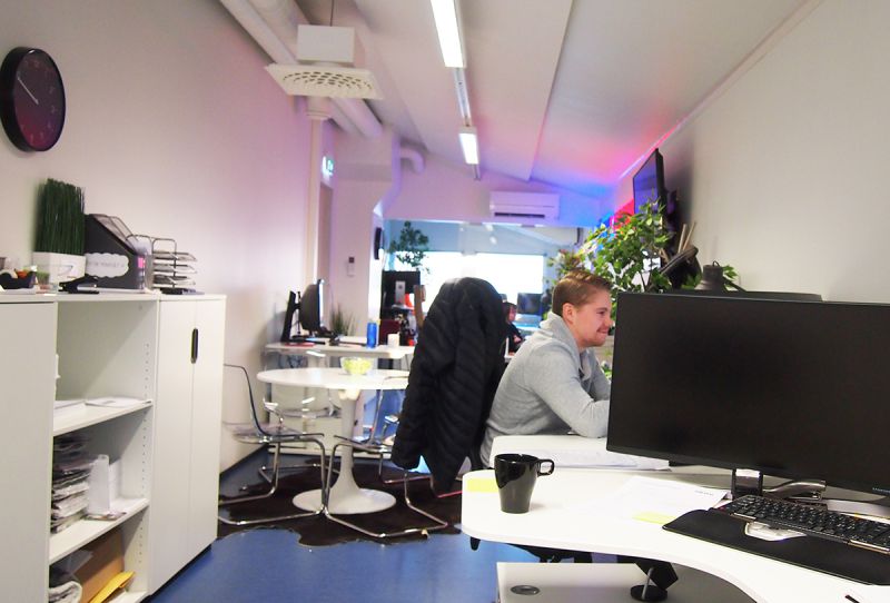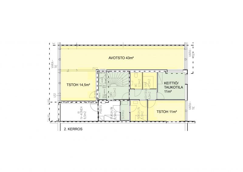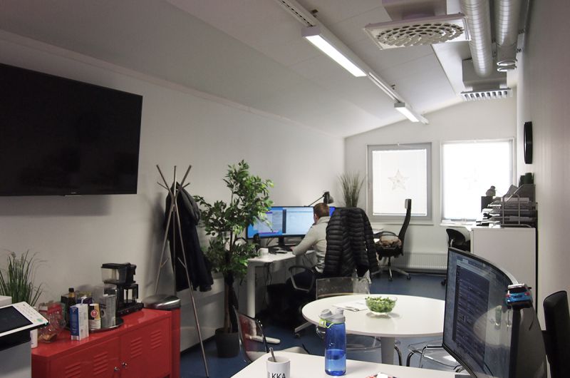 Noin 80m² tilat sijaitsevat rakennuksen toisessa kerroksessa. Tilassa on pitkänmallinen avokonttori, kaksi erillistä toimistohuonetta sekä pukuhuone, wc ja varastotila. Huoneet on merkitty pohjakuvaan keltaisella värillä. Lisäksi tulevat yhteiskäytössä oleva keittiö/taukotila ja suihku (pohjakuvassa vihreällä).