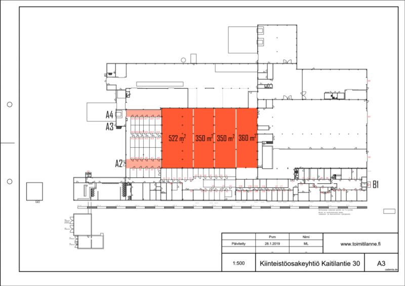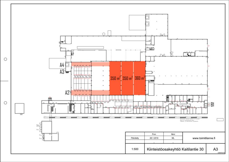 Vuokrattavana laaja varasto- tai tuotantotila 1060 m²-1582 m²-2828 m². Tila on n. 7 metriä korkeaa. Tiloihin 1060 m² ja 1582 m² on sisäänajomahdollisuus alle 3 m korkealla kalustolla. Varastossa 2828 m² on iso nosto-ovi ja mahdollistaa sisäänajon isommallakin kalustolla.