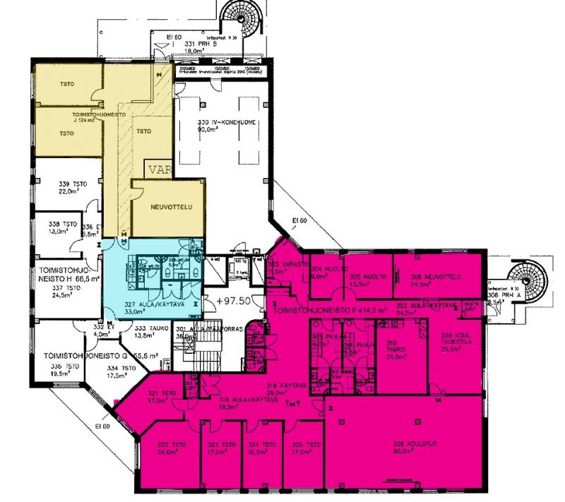 Muuttovalmis toimisto 414 m² (pohjakuvassa pinkki alue) sisältää: