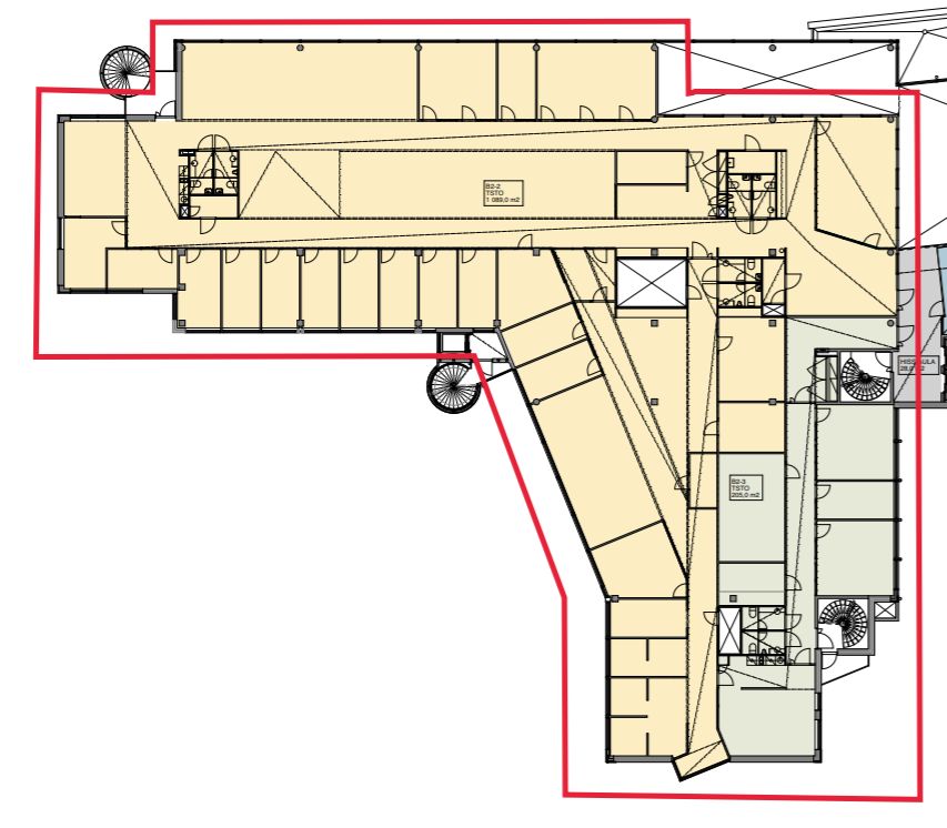 Kyseinen 1296 m² toimistotila sijaitsee B-talon 2. kerroksessa. Se koostuu avotilasta ja huoneista. Keittiö- ja wc-tilat ovat kerroksen vuokralaisten yhteiskäytössä. Kuvat ovat yleiskuvia kiinteistön tiloista.