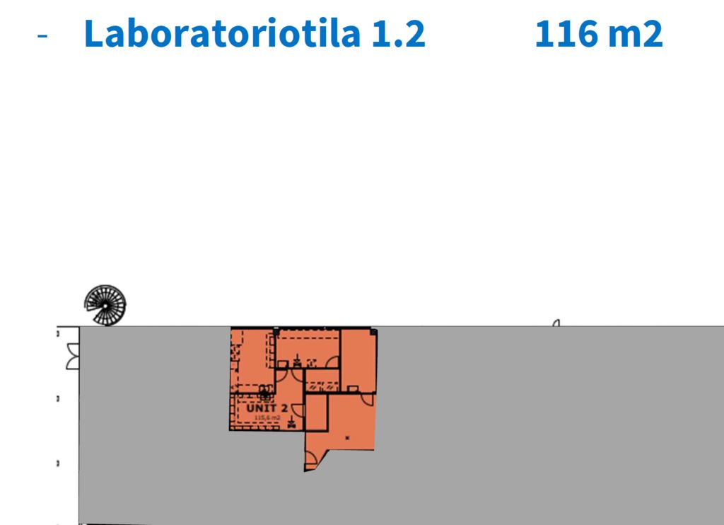 Tämä 116 m² toimitila sijaitsee kiinteistön katutasossa. Tila on ollut laboratoriona, mutta se on mahdollista muuttaa toimistoksi. Soveltuu myös kevyeeseen tuotantoon.
