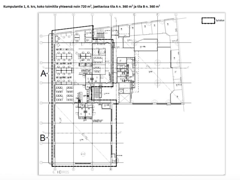 Tämä 720m2 toimistotila sijaitsee kiinteistön 6. kerroksessa. Tila on avonainen, ja siihen kuuluu kaksi keittiöpistettä ja useita wc-tiloja. Toimisto on mahdollista jakaa kahteen 360m2 osaan. Toimisto on täysin saneerattu ja siinä on jäähdyttävä ilmastointi.