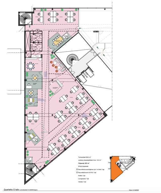 Kyseinen 636,5m2 sijaitsee Estrade-talon 5. kerroksessa. Toimistossa on avotilaa, työ-/neuvotteluhuoneita sekä omat keittiö- ja wc-tilat. Tilaan tulee lisäksi 14,5m2 jyvityksiä yhteiskäyttöisistä tiloista.
