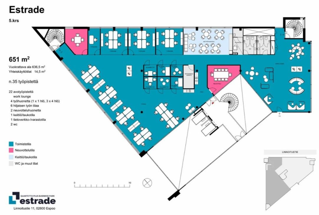 Vuokrattavana 5. kerroksen 636.5m2 toimistotila johon lisätään yhteiskäyttötiloja 14.5m2.