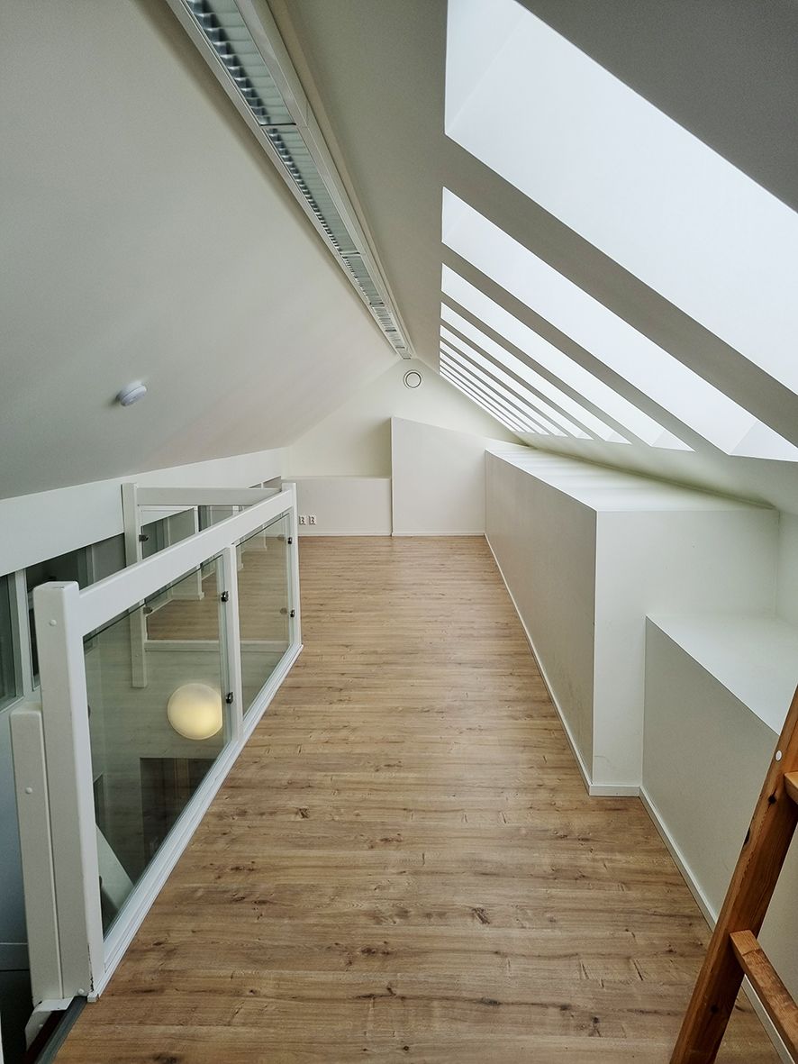 Jäähdytettyä persoonallista toimistotilaa, joka on rakennettu talon ullakkokerroksiin vuosina 2007-2008.