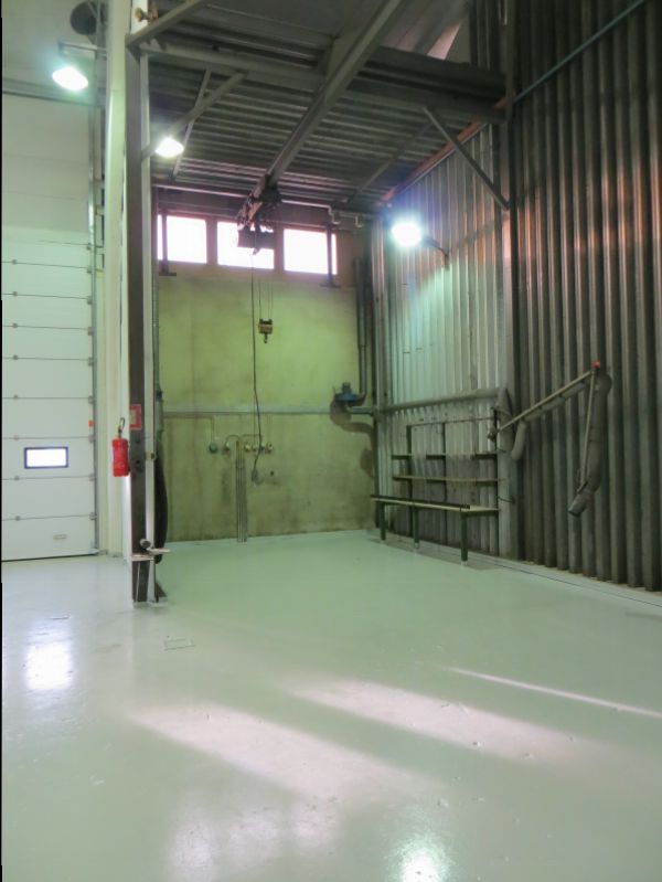 Hallitilan pinta-ala 550m2, jossa vapaa korkeus n.9m. Tilassa kolme nosto-ovea (5m x4,5m) joista ajettavissa kuorma-autolla sisään, yksi ovista vie pesuhalliin. Hallin yhteydessä ikkunallinen toimistohuone sekä 100m2 tilavat sosiaalitilat 2. kerroksessa omalla keittiöllä.