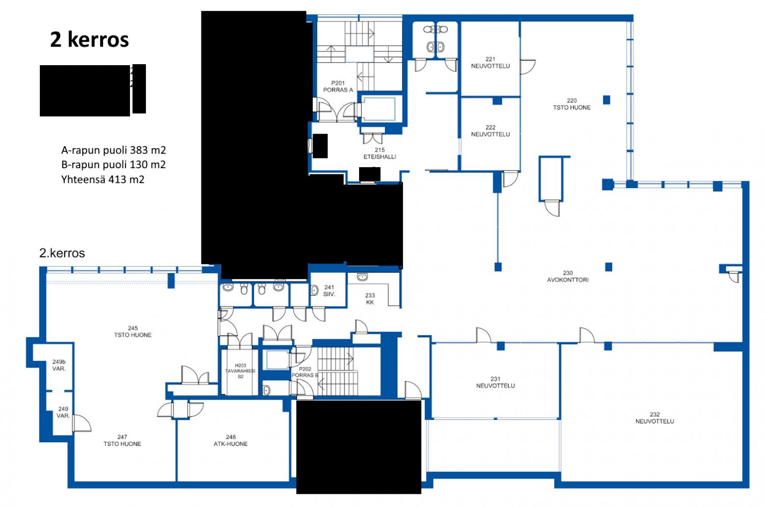 Talossa kaksi porraskäytävää, joissa molemmissa hissi. B-portaan puolella tavarahissi toiseen kerrokseen. Tilat soveltuvat monipuoliseen toimistokäyttöön. Tämä toinen kerros on pitkälti monitoimitilaa aputiloineen. Hyväkuntoista tilaa esimerkiksi etätyöperiaatteella toimivalle yritykselle kokoontumistilana. Tilassa on useita neuvotteluhuoneita ja ryhmätyötiloja. Tilan voi muokata myös täysin avotilaksi tai rakentaa jonkun huoneenkin lisää.