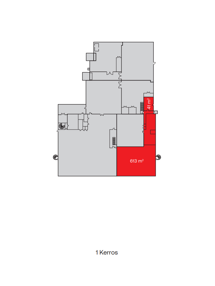 Ensimmäisen kerroksen varastotila, johon katutason yhteys matalalla (n. 2,5 m) nosto-ovella. Selkeä pohja. Ei väliseiniä muuhun kokonaisuuteen.
