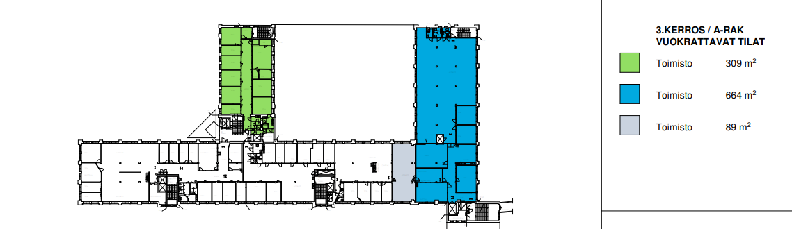 Vuokrataan n. 309 m2 hyväkuntoista, monipuolista toimistotilaa Kivääritehtaalta kolmannesta kerroksesta. Historiallisen rakennuksen sisätilat on modernisoitu vastaamaan nykyaikaisia toimistotarpeita. Tilan kokoonpanoon kuuluu erikokoisia toimistohuoneita (osa hyödynnettävissä myös neuvotteluhuoneena) sekä pieni keittiötila ja omat WC-tilat, ks. pohjakuva.