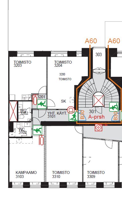 Tamperelaisittain Turvantalo, jossa pienehköjä toimistohuoneita. Toimistoja n. 20m2, 78m2, 258m2 (iso sosiaalitila).