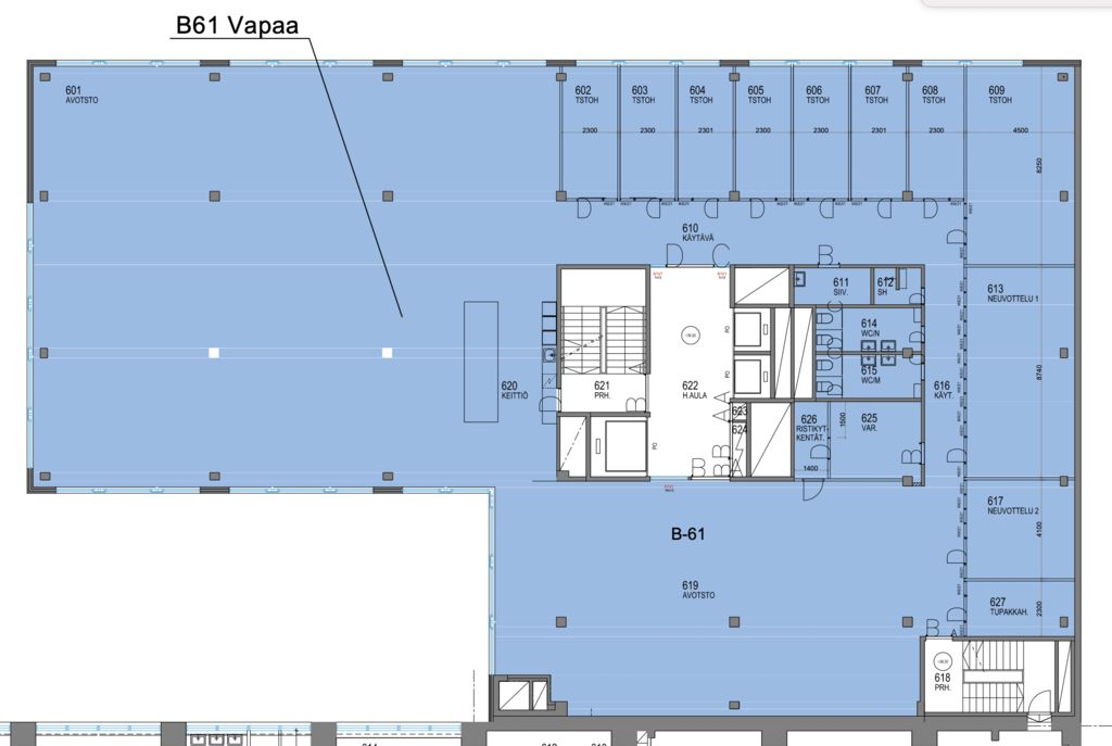 Tämä 865m2 tila sijaitsee kiinteistön 6. kerroksessa. Toimistossa on runsaasti avotilaa, pieniä työhuoneita, erikokoisia neuvottelutiloja sekä omat keittiö- ja wc-tilat. Kuvat ovat yleiskuvia kiinteistön tiloista.