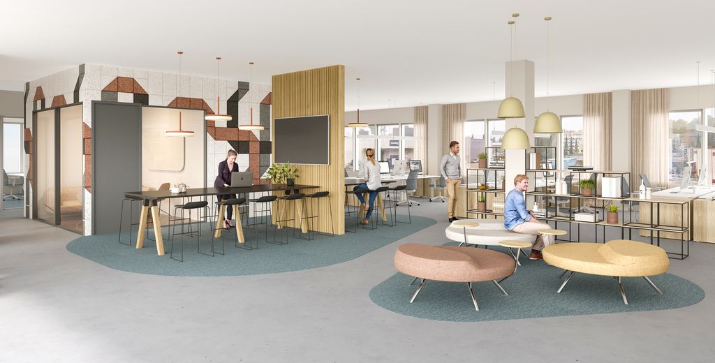 Tämä toimisto on kooltaan 740m2 ja se sijaitsee kiinteistön 3. kerroksessa. Toimistossa on huoneita, avotilaa sekä omat keittiö- ja wc-tilat. Kerros on mahdollista jakaa noin 375,5m2 ja 308,5m2 osiin. Kuvat ovat havainnekuvia toimistotiloista.