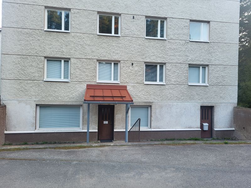 Huoneisto asemoituu talon päätyyn ja siihen on oma sisäänkäynti. Huoneiston edessä on useita parkkipaikkoja.