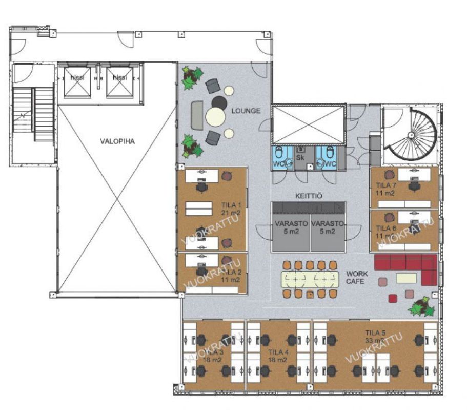 Vuokrattavana pientoimistohuone, johon mahtuu työskentelemään jopa 4 henkilöä. Tila on kalustamaton, mutta mahdollista saada myös kalustettuna. Yhteiskäytössä muiden pientoimiston vuokralaisten kanssa keittiö, wc:t ja lounge/taukotila.