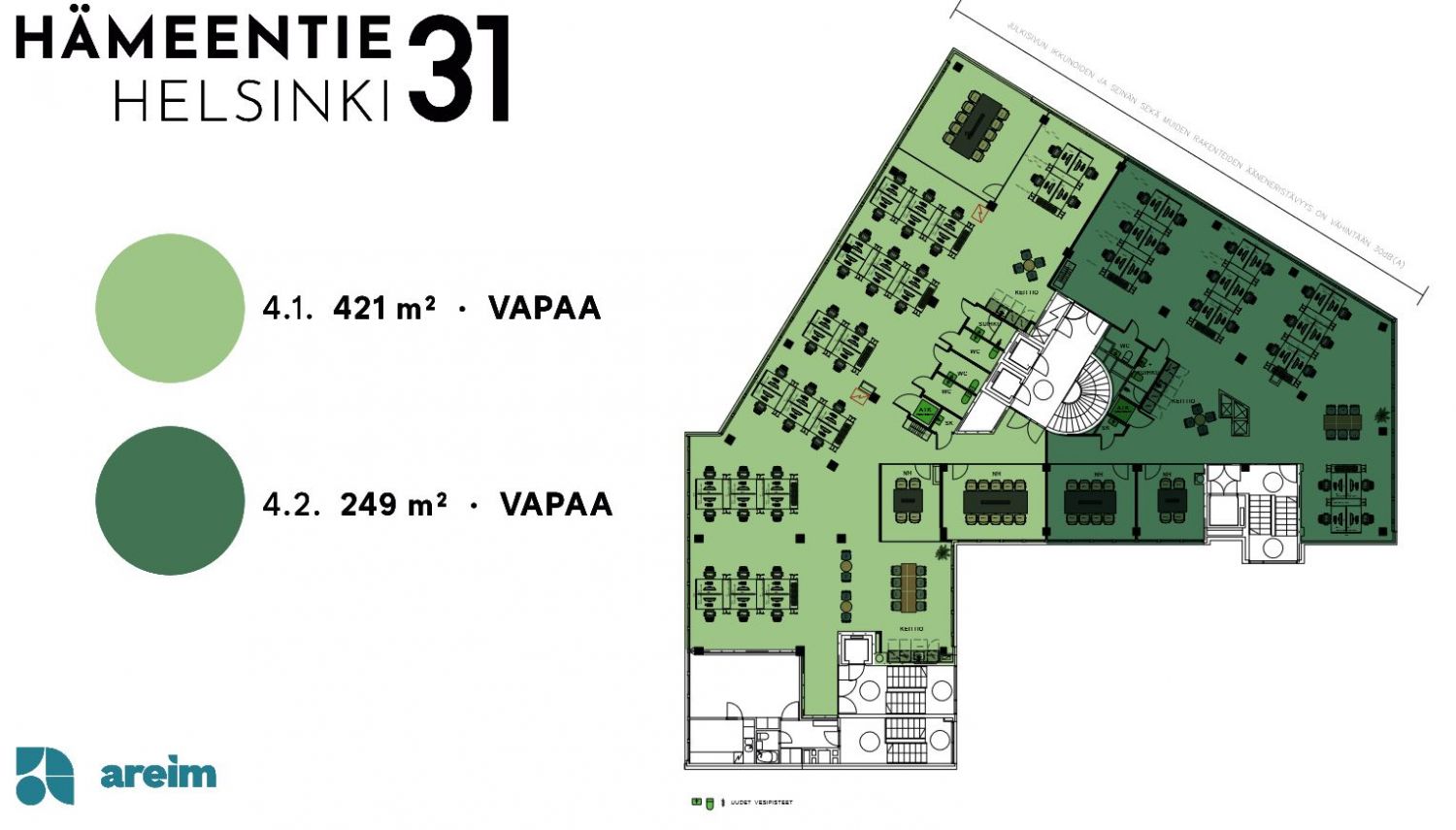 Hämeentie 31:n vuokrattavat tilat sijaitsevat kerroksissa 3-9. Kerrosten pinta-alat sijoittuvat välille 545-720 neliömetriä. Yksi kerros on mahdollista jakaa kahteen tai kolmeen osaan, eli tilakoot alkavat noin 200 neliöstä ylöspäin.