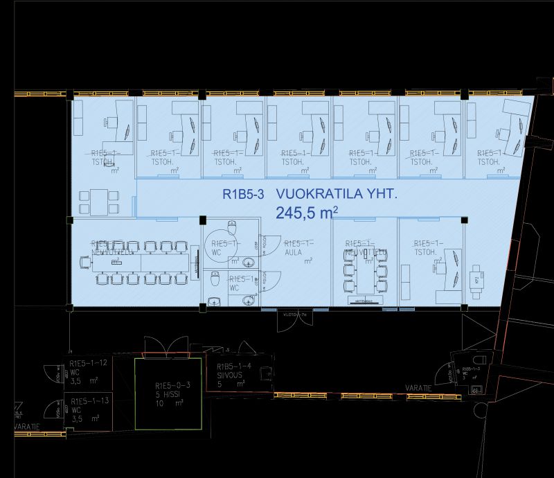 Vuokrattavana ylimmässä kerroksessa sijaitsevaa rakentamaton toimistotila, ns. raakatila, johon mahdollista rakentaa useita toimistohuoneita.