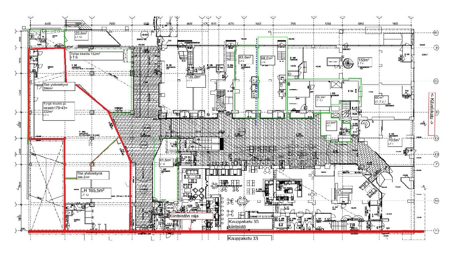 Pohjakuvan tilat B222-B225 kuuluvat tähän kokonaisuuteen. Käynti tiloihin Versonraitilta, ikkunat Kauppalaiskujalle.
