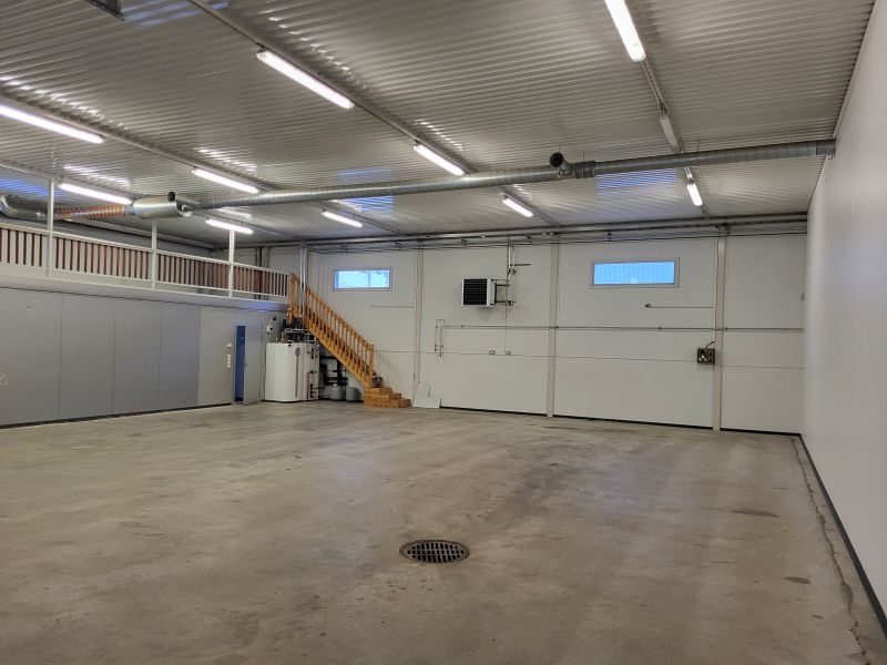 2 hallitilaa, n.290m² ja n.230m². Isommassa myös pesuhallitila. Koko hallitila 520m² jaettu kevyellä väliseinällä, jonka voi tarpeen mukaan purkaa.