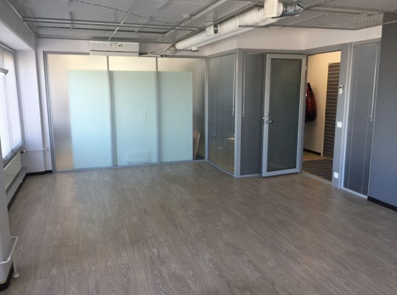 Valoisa avotoimistotila rakennuksen ylimmässä kerroksessa. Yhteiskäyttöiset keittiö- ja sosiaalitilat.