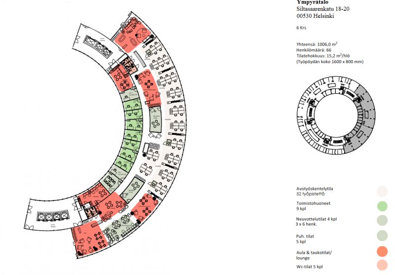 Ympyrätalon vuokrattavana 6. kerroksen toimisto ( 1006 m2). Isot ikkunat. Tila on muokattavissa asiakkaan tarpeiden mukaan.