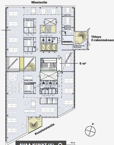 Vuokraan kuuluu lounge ja lukuisten neuvottelutilojen käyttö.