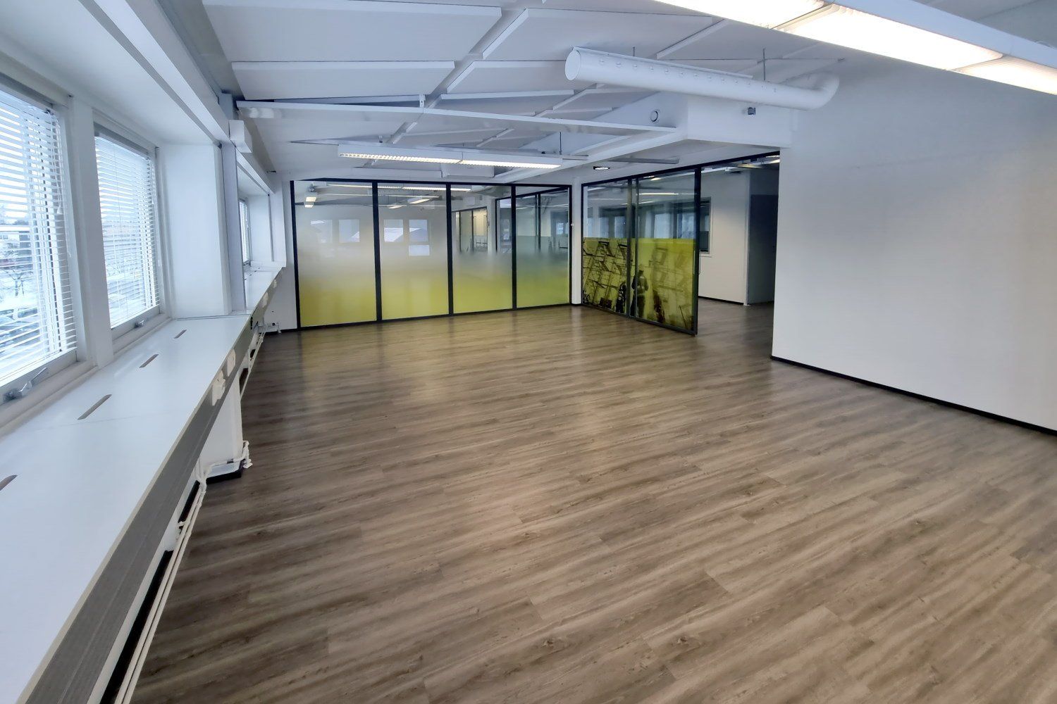 Modernia toimistotilaa rakennuksen toisessa kerroksessa. Alunperin 826 m2:n kokoisesta tilasta voi vuokrata 364 m2 tai 464 m2. Kellarikerroksesta voi vuokrata lisäksi erillisen saunallisen pukuhuonetilan.