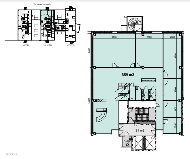 Tämä 359m2 toimistotila sijaitsee Spurtti-talon 4.kerroksessa. Toimistossa on 10-40m2 kokoisia työtiloja, oma keittiö ja taukotila sekä wc-tilat. Tilaan on mahdollista rakentaa työhuoneita tarpeen mukaan.
