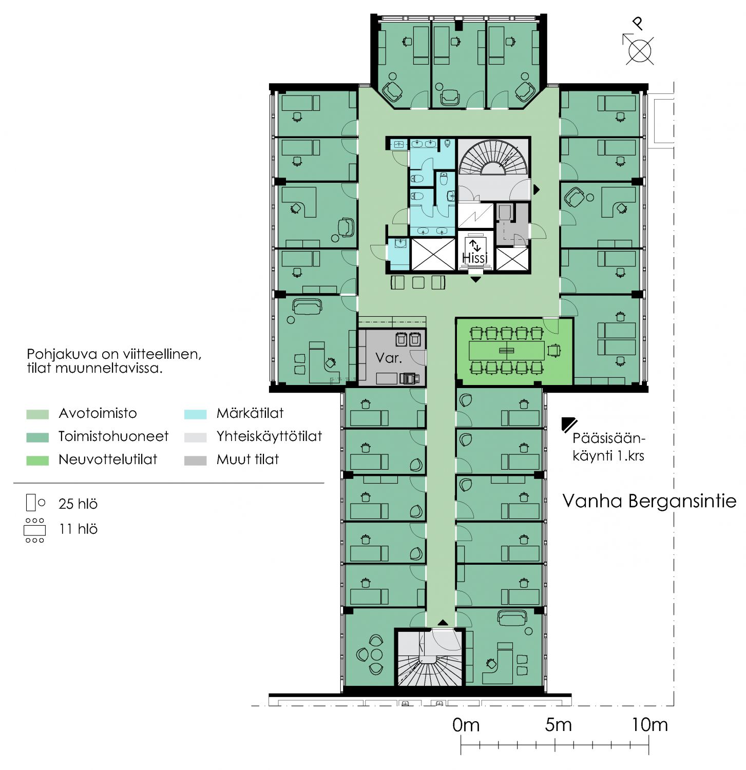 Siisti toimistotila, jossa toimistohuoneita. Hissi tuo suoraan tilaan.