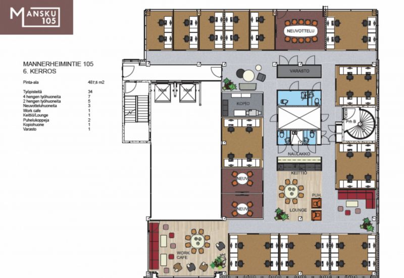 Vuokrataan kiinteistön 6. kerroksessa 487,5 m² avara ja valoisa toimitila. Tiloista avautuu hieno vehreä näkymä idylliseen Ruskeasuon siirtolapuutarhaan. Kiinteistön aulatila on uudistettu ja remontoitu kesällä 2020. Edustava ja viihtyisä aula toimii yrityksen käyntikorttina asiakkaille sekä henkilöstölle.