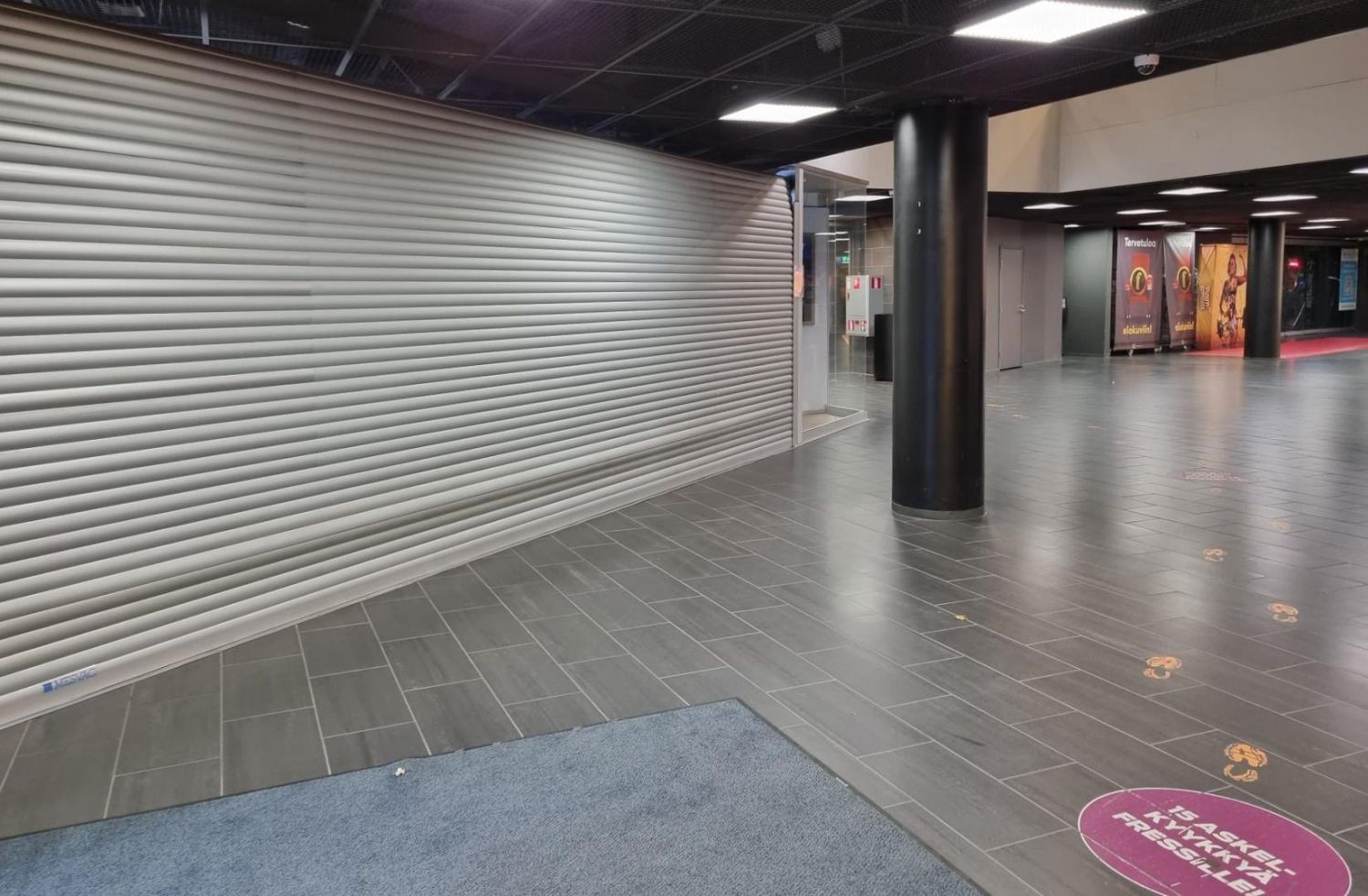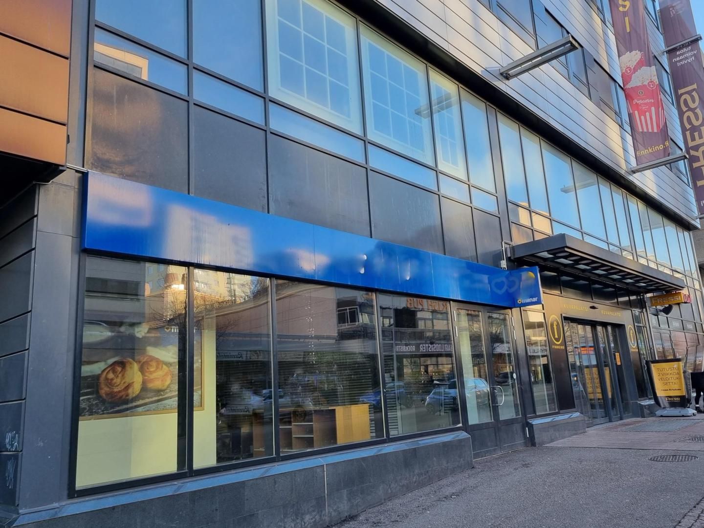 Näyteikkunat Vapaudenkadulle ja sisäänkäynti elokuvateatterin sisäänkäynnissä.