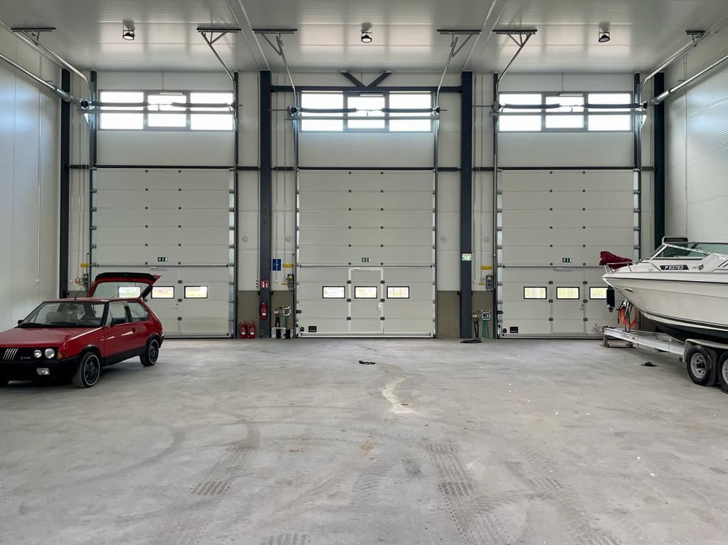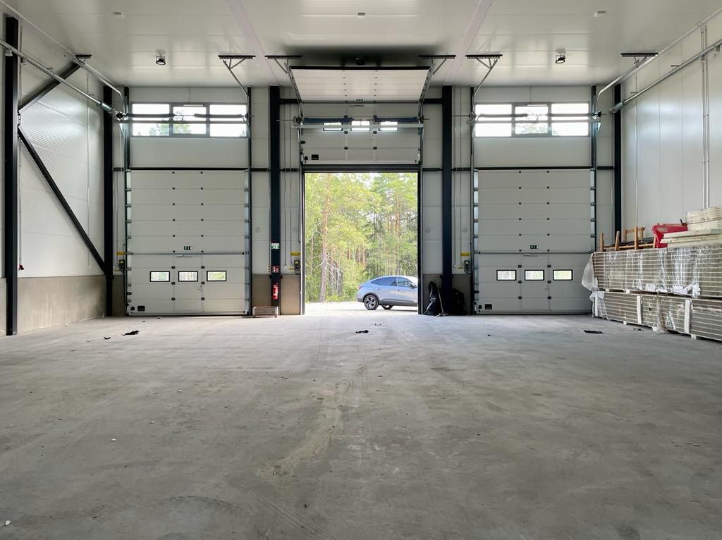 Korkea, uudenveroinen läpiajettava hallitila. Vapaa korkeus 8 metriä. Sähköiset 5 m korkeat nosto-ovet vastakkaisilla seinillä.